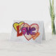 Ord "Kärlek" målade i rött, rosa och lila mot gult, rosa och orange. Hjärtan överlappar varandra och blandar färg på samma sätt som kärlek i kärlek. Den här målningen kommer också in i en version utan glitter. Anpassa det här hälsningskortet för ord-bilder i kärlek med egen text och bilder med hjälp av knappen "Anpassa det".