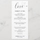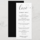 Sött bröllopsmenykort med en enkel och minimalistisk design med ordet "kärlek" i en elegant typografi med ett hjärta i slutet. Nedan visas din meny i en modern sans-serif tillsammans med dina namn och datum. Dessa minimalistiska bröllopsmenykort är ett bra sätt att lägga till ett element av stil och formalitet till din speciella dag.