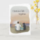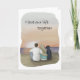 Vacker, romantisk vykort med ett par med en hund som sitter på en strand och tittar på en solnedgång. Perfekt för Alla hjärtans dag för ägare av svart labrador.