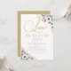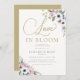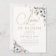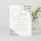 En elegant och modern "Kärlek är i Bloom" inbjudningskort för möhippan med en vattenfärgad blommigt ram av vita anemoner, rosa ros, fyllnadsblommor och löv i en arrangemang lush blommigt. I eleganten har inbjudningskort för möhippan också en romantisk, modern kalligrafi med gott om blomning och en antydan om guld i färg i titeln och baksidan.