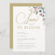 En elegant och modern "Kärlek är i Bloom" inbjudningskort för möhippan med en vattenfärgad blommigt ram av vita anemoner, rosa ros, fyllnadsblommor och löv i en arrangemang lush blommigt. I eleganten har inbjudningskort för möhippan också en romantisk, modern kalligrafi med gott om blomning och en antydan om guld i färg i titeln och baksidan.