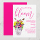 Kärlek är i blomning! Uppsamling av vibrant blommigt bröllop med en bouquet i en marmor vas omgiven av fjärilar och åtföljd av fuchsia-manusmanus-typografi.