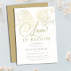 En elegant och modern "Kärlek är i Bloom" inbjudningskort för möhippan med en skiss av två blommande ponnyer med guld-folie (inte äkta guld, detta är en digital effekt). Den här eleganten inbjudningskort för möhippan har också romantisk, modern kalligrafi med gott om blomning.