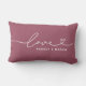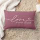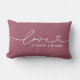 Modern och stilren anpassad ländryggskastkudde design har en enkel och minimalistisk "Kärlek" typografi design som inkluderar detaljer i form av svängar och hjärta. Anpassa versal text nedan med en monogram för ett par eller familj, en citat eller annan föredragen text. De rosé vinröda och vita färgerna kan ändras.