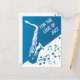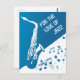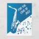 Det här vykortet innehåller ett blåvitt dominerande färg, en platt saxofonbild, musik noter, blå hjärtan och anpassadets standardtext "för kärlek i jazz". Det är en underbar design för musik och jazz älskare!
