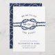 Meddela din bröllop till familj och vänner med den här kustnära chicen att spara datumkorten i den klassiska marinen blått och vitt. Utformningen har en skarp repillustration med bröllop-datumet i mitten, omgiven av "vi är gifter sig!" Anpassa dessa nautiska spara datumkorten med namn, bröllop-datum, plats och bröllop webbplats, eller en indikation på att en formell inbjudan kommer att följa. Kort på ett loopande nautiska rep mönster i vitt på flottan.