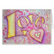 Vattenfärgning av den gyllene gulten ord "Kärlek" med dubbla. Rosa och lila belyser brev och hjärtat. Ett ljus stänk i glitter över ge överst målar en glatt glöd.