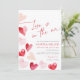Den här Valentine Inbjudningskort för möhippan har hand plockade vattenfärgshjärtan i rött och rosa. Det moderna Alla hjärtans tema är perfekt för ett Kärlek ligger i Luft party. På baksidan kan du lägga till ett eget foto av den vackra brud som ska visas. Det finns även matchande kartor och skyltar för djurutrymme i den här utformningen.