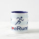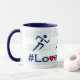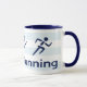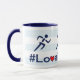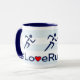 Njut inte bara av att köra: #LoveRunning! En mugg för vem som helst - en maratonspringer, triatlon eller spårbunden idrottsman, cross country springer, eller för någon som bara tycker om att behållan passar. Enkel text i marinen med rött hjärta och tre piktogramspringer ovanför, på en blek blå stripe-bakgrund.