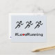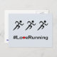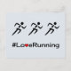 Njut inte bara av att köra: #LoveRunning! Ett vykort för vem som helst - en maratonspringer, triatlon eller spårbar idrottsman, cross country springer, eller för någon som bara tycker om att passa behållan. Enkel text i svart med rött hjärta, skapande hashtaggsslogan. Tre piktogram springer över, på blekens blå bakgrund.