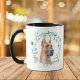 "KÄRLEK my DANE" deklarerar mugg som ägare till en Hund i Great dane. På vardera sidan om mugg finns en vacker vattenfärg porträtt i en begynnad färgad Dane inramad i en blå grönt löv-andedräkt. Mellan två bilder finns texten som du enkelt kan anpassa eller till och med ta bort.