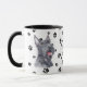 Mugg för Scottish Terrier Hundägare har en skotsk konstnärs vattenfärg porträtt. Bilden skrivs ut två gånger, och mellan dem är en oval med den svarta texten "Kärlek my Scottie". Ovala och hund placeras på en bakgrund som är sprinklad med svart tass avtryck. Du kan enkelt ändra texten till något annat, eller anpassa den om du vill.