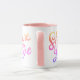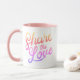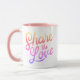 Kaffe mugg har frasen " Kärlek" i rosa övertoningsskript.