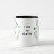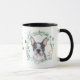 "KÄRLEK MY BOSTON" deklarerar mugg för Boston Terrier Hund älskare. På båda sidor om mugg finns en vacker vattenfärg porträtt från en Boston Terrier i en blå grönt löv-andedräkt. Mellan två bilder finns texten som du enkelt kan anpassa eller till och med ta bort.