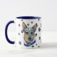 Mugg för Australian Cattle Hundägare har en konstnärs vattenfärg porträtt i ett vackert blått och brunt i Cattle Hund med blå halsduk. Bilden trycks två gånger och mellan dem är en oval med den svarta texten "Kärlek my Cattle Hund". Ovala och hund placeras på en vit bakgrund sprinklad med svart tass avtryck. Du kan enkelt ändra texten till något annat, eller anpassa den om du vill.