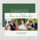Personlig bröllop-fotokort för att säga "kärlek och tack" till dina gäster. Fotomallen är inställd på redo så att du kan lägga till 3 foton (2x fyrkantig/liggande och 1x porträtt) samt ditt meddelande om namn, bröllop datum och anpassningsbar. Den här enkla och moderna designen är i jägare grönt och vit med handskrivna eleganter och modern sans serif-typografi.