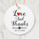 Kärlek och tack kalligraphy red eart bröllopsfavoritMärkre. En elegant föredrar att märka med "Kärlek och tack" i ett handskrivet stil, namn och ett rött kärlek-hjärta.