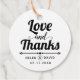 Kärlek och tack elegant, svart och vit typografi, bröllopsfavoriter Märkre. En elegant befordrar taggdesign med frasen "Kärlek och tack" i ett fet typografi stil, en svart delare och namn.