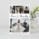 Elegant, Modern Script Photo Collage Bröllop - tack för ditt kort i svartvitt. Minimalistisk utformning av bröllop-kort med fyra (4) rasterfotokollage på framsidan och ett (1) foto på baksidan. "Kärlek och tack" text i ett handskrivet kalligrafiskt sött hjärtteckensnittsskript med bytt svan. Lägg till ditt namn och tack. Om du behöver hjälp eller matcha objekt kontaktar du designern!