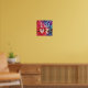 Den här groovy hippie boho-designen har en vacker batik tie-dye mönster i skuggor av shock rosa fuchsia magenta, teal, blue, lila och black. I mitten finns ord, Kärlek i delvis genomskinligt vitt i populär vintage, modern typografi, placerad på en kvadrat, så att designen syns genom brev, med ett fredstecken för "O" och ett hjärta för "V".