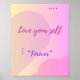 Denna väggkonst betonar det upplyftande budskapet "Kärlek Yourself", skrivet i fet snyggt typografi för att inspirera till självbestämmande och självvård. Om du ställer in gradientbakgrunden för en kalkeringspastel försvinner värme och positivitet. Fintliga accenter som hjärtan, motiv för mjuka blommigtar eller små gnistor omger texten, skapar en harmonisk och inbjudande design. Perfekt för vilket utrymme som helst, detta biet är en försiktig påminnelse om att prioritera kärlek och värna om din individualitet.