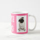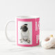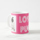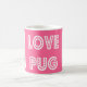 Visa kärlek för Pug med den här söta Pug mugg. Det här roligt kaffet mugg har en porträtt av en hund av Pug valp som markeras mot en ljus rosa bakgrund med ord Kärlek Pug i ett stort roligt visstiskt teckensnitt.