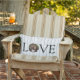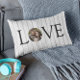 Modern och snyggt kärlek dekorativ kudde med ord "KÄRLEK" och brev "O" skapat med din egen personlig-foto mot bakgrund av ett strålträ. Fotomall via Pixabay med licens enligt CC0 och måste ersättas med ditt eget foto