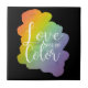 Den här keramiska plattan innehåller ett inspirerande citat i ett handskrivet skript som säger "Kärlek ser inget färg" mot en regnbågsbakgrund med vattenfärg.