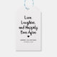 Enkla men effektiva moderna svarta och vita bröllop gynnar märkre med det vackra citatet "Kärlek, Skratt, och lyckligtvis allt efter", namn och datum.