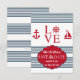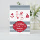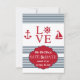 Ett klämmigt, nautiskt, spara datum meddelande för älskare och sjömän. Vitbakgrundssärdragen slösar randar och röda nautiska motiv. Ordkärleken har en roder i stället av brev "nolla". (FP)
