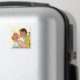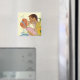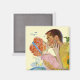 Artist:Bernard D'Andrea | Rött kyssande man i dam bakom solblommor med blå stol och katt.