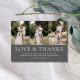 din tacksamhet med Kärlek och tack för 3-foto-Bröllop-tackkortet. Den här designen har plats för tre av dina favoritfoton i bröllop, som är snyggt placerade vid eleganten "Kärlek & Tack"-typografi. Anpassa den ytterligare med ett hjärtligt tack-du-meddelande för att göra den till en unik nyckelfråga för dina gäster. Perfekt för par som vill visa upp fler minnen från sin speciella dag, kombinerar detta kort stil och känslan att skapa ett bestående intryck. Det är det perfekta sättet att uttrycka uppskattning och samtidigt återfå glädjen i din bröllopsdag.