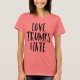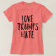 Den här designen innehåller frasen "kärlek trumps hatets" skriven i en svart penselskrift