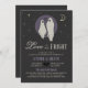 Perfektens romantiska men pookiska inbjudan till ditt Halloween-pars dusch, här är en Kärlek på första skrämda temainbjudan med ett spooky par som står nära varandra och blundar in i varandras ihåliga ögon med ett hjärta som frambesvärjs mellan dem mot bakgrund av en stjärnanfall vid midnatt himmel med ett halvmånigt måne i dammiga granater av kol, benvitt och lila.