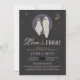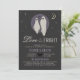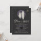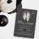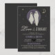 Den perfekta romantiska men skräckinjagande inbjudan till din Halloween-parmiddag, här är en Kärlek vid första skräcken-tematiserad inbjudan med ett spöklikt par som står tätt ihop och stirrar in i varandras ihåliga ögon med ett hjärta som frammanas mellan dem mot en bakgrund av en stjärnklar midnatthimmel med en halvmåne i dammiga nyanser av kol, off-white och lila.