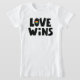 Den här designen innehåller frasen Kärlek vinner med ett färgstarkt regnbåge.