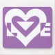 En grafisk logotyp, anpassningsbar. KÄRLEK i vitt på lila.