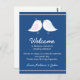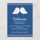 Det här bröllop välkomstpaket kortet har två söta kärleksfåglar som står mittemot varandra, en marinblå bakgrund och anpassningsbar text. Bakgrundsfärgen kan ändras genom att välja knappen anpassa och sedan redigera. Det här kortet kan fästas på välkomstpresenter/väska för bröllopsgäster från andra städer.