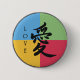En bakgrund för rundapopkonst av blått, grönt, guld och röda servar som bakgrunden till ett KanjiCalligraphysymbol av KÄRLEK, i svart silhouette bildar. Spridning meddelandet av kärlek i höftmode! Underbar gåvaidé!