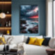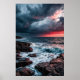 Våldsamma vågor kraschar mot mörka klippor under en dramatisk himmel badad i karmosinröda och blå nyanser. Ett kraftfullt verk som fångar naturens vilda skönhet och ögonblicket då en storm möter solnedgången.