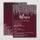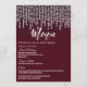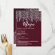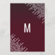Eleganta, snygga och glamourösa vita hängande diamantljus på vinröda menykort för bröllopsmottagning. Denna klassiska och sofistikerade design är perfekt för det klassiska, stilrena och trendiga bröllopsmottagningen. Anpassa med din egen meny på framsidan, tillsammans med era namn och datum. Anpassa sedan baksidan med er monograminitial. Allt är fotoprintdesign.