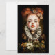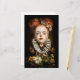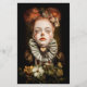 🖤 Detta konstverk kombinerar karneval noirens charm med fantasifull underlighet. Motivets centralgestalt är en flicka med invecklad frisyr i kastanjebrunt hår, prydd med en lappad båge med vintage-mönster och små dekorativa accenter. Hennes porslinsliknande ansikte är målat med teatralisk clownmakeup, inklusive känsliga tårstrimmor och en liten hjärt detalj på kinden, som frammanar en bitterljuv, romantisk stämning. Hon bär en utsmyckad klänning med randig, skrynklig krage och ett hjärtformat hänge runt halsen. Buketten med livfulla gula och vita blommor hon håller i lägger till en mjuk, naturlig kontrast till hennes dramatiska utseende. Den övergripande estetiken efterliknar rikedomarna i en oljemålning