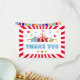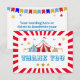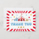 Designen har en röd bakgrund och karnevalsclipart. Skriv ditt eget tackmeddelande över exempelttexten eller ta bort det för att skriva din egen personliga hälsning på baksidan. För att få tillgång till avancerade redigeringsverktyg, gå till ” Anpassa”, scrolla ned och tryck på länken "klicka för att anpassa ytterligare".