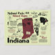 Konstnärligt karta, skapat av Indianas nationella skyddsmyndighet, med alla nationella parker märkta och kortfattade beskrivningar och illustrationer.