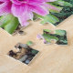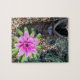 Perfektens pussel för naturen älskare. Det här fotot av MiaMoon Photography har förvandlats till ett pussel. Det är av en metall cowboybock och en rosa blomma på en sten säng med grön kraft.