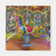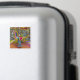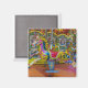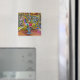 Ett nära foto av färglösa hästar på en rund cirkel som trycks på en fyrkantig kylmagnet.