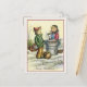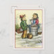 Ett vykort för vintage, ett återskapat och retuscherat antika teckning, med en liten pojke, med helgdag i ett basket och en liten flicka som rostar kastanjer medan det snöar.