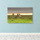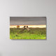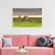 Kanvastryck av två vilder konikhästar i nationalparken Oostvaarders Plassen i Nederländerna vid solnedgången.