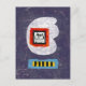En lustig kattillustration över en lila och vit bakgrund med gult och svart rand på blå.