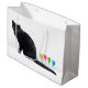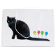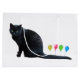 En svart katt med ballonger på det är svan. En presentpåse på roligten.